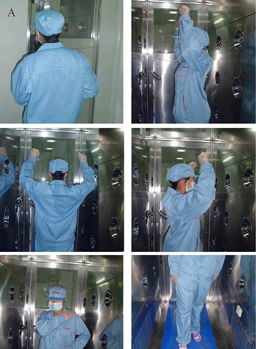 1、進(jìn)門,從非潔凈室進(jìn)入潔凈室。步驟分別是打開外門,內(nèi)門上電鎖,進(jìn)入風(fēng)淋室,關(guān)上外門,內(nèi)外門自鎖,紅外感應(yīng)吹淋開始,吹淋完畢,進(jìn)入潔凈室。